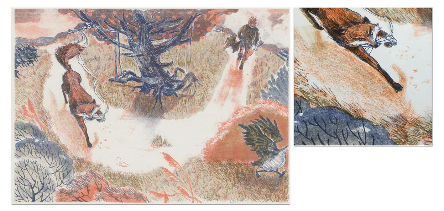 The draughts manship is highly skilled, as is the general use of chosen medium and limited colour, giving a consistent, organic aesthetic. The fox character is well developed, grounded in strong observational drawing. The book combines the sense of the traditional tale with modern outlook. This is demonstrated by the occasional use of irony and comedy.