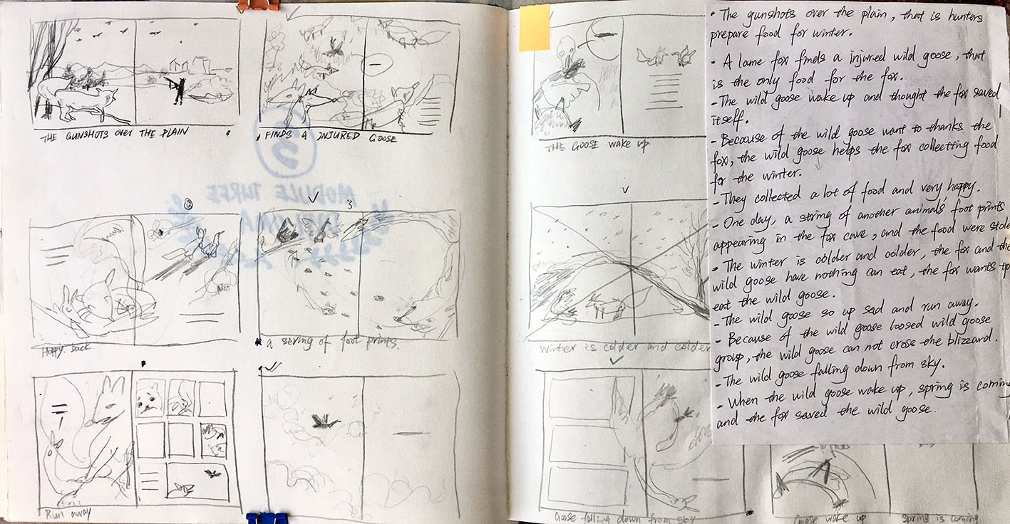 我选择了狐狸和大雁作为故事的主角,每个动物在人类认知中有着不同的含义,体现在儿童故事中也是一样。狐狸因其”形象不雅”,多与狡诈鬼祟有关,而大雁自古被视为“五常俱全”的生物,群居生活,助老扶幼。所以故事中的狐狸和大雁指代的是两种不同性格的人,大雁因其群居,所以更容易相信、帮助别的动物,十分热情。狐狸则更冷淡、自我、善于撒谎。但为了避免故事过于脸谱化,乐观的大雁也会爆发,狡诈的狐狸也会自责,所以在这个故事中狐狸也不算是绝对的“坏人”。