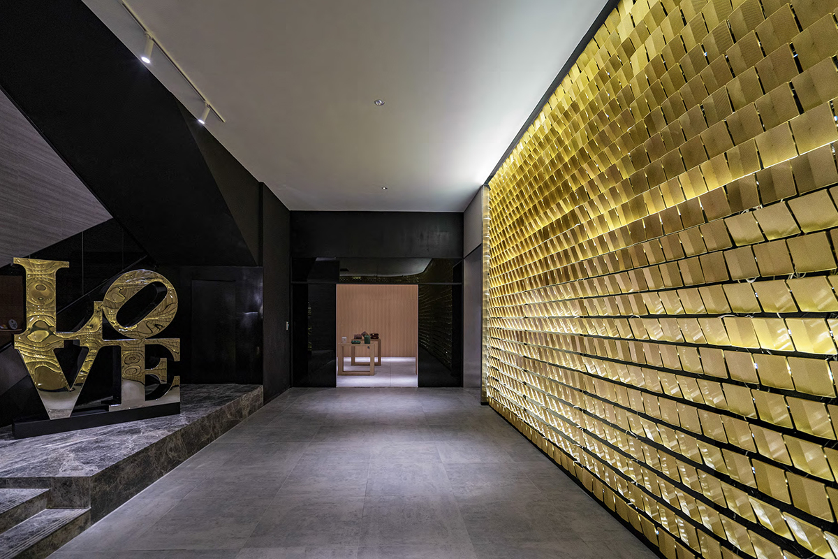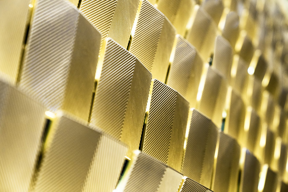 展厅的墙面,是以马口铁铸上刻度纹理,堆砌而成的金色砖墙。统一的安装角度与灯光配合,阵列使空间呈现着庄严,让到访者进入空间,正视这一企业的文化与规模;铁砖层叠排布,折射出金色的光芒,寓意企业从原材料到产品不断打磨,对品质追求的闪光。