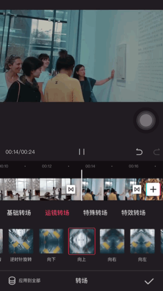 更加厉害的是有“推进”“旋转”“向上”等运镜转场,这些是Pr等专业视频剪辑软件都要设置的功能,但在剪映中可以一键完成,应用在旅行和vlog非常酷炫;