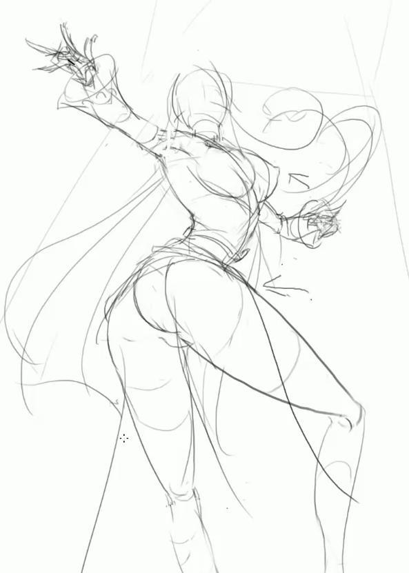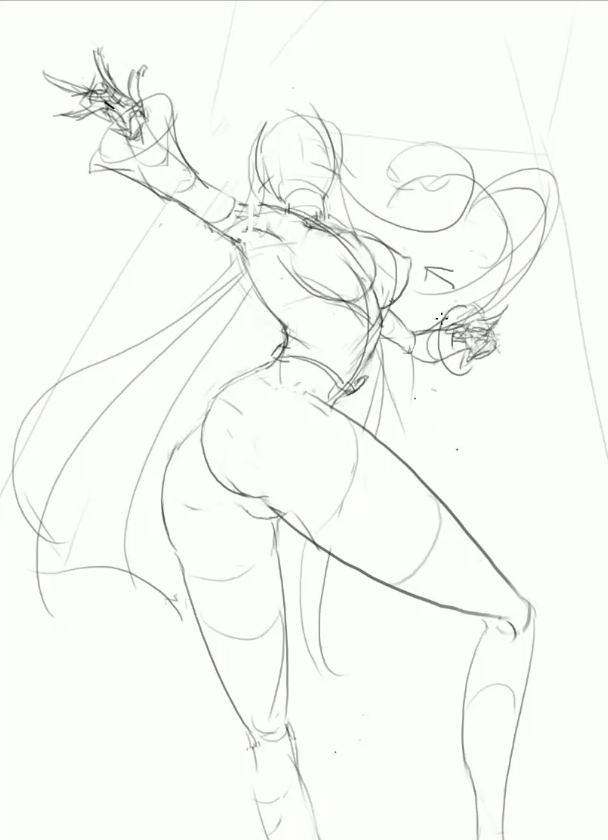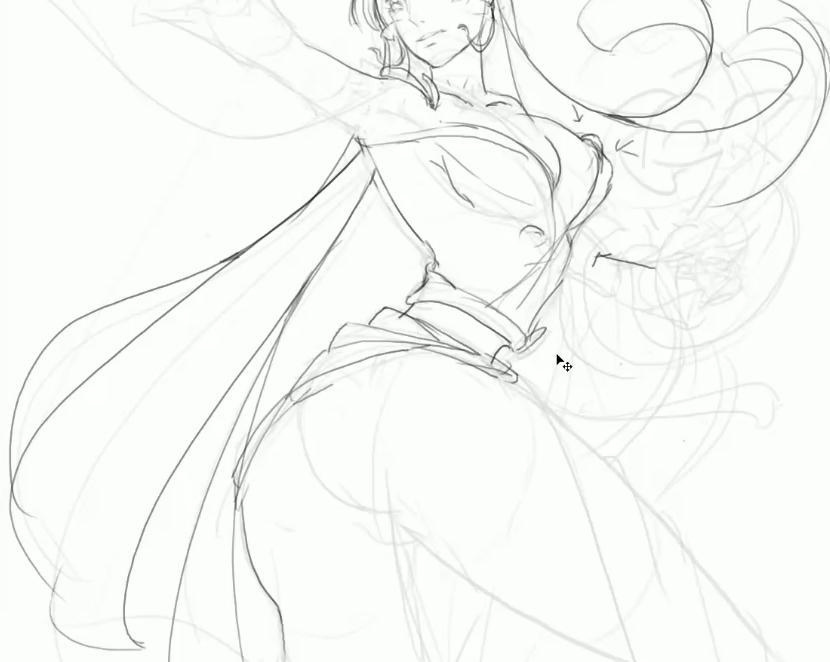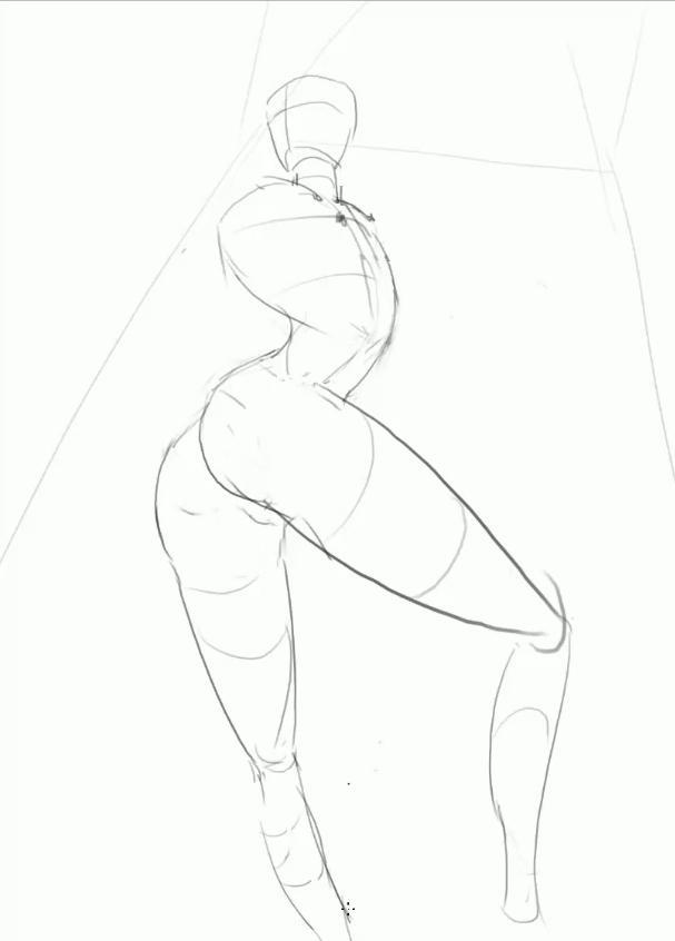 5、把形体动态确定好之后,把臀部细节和衣服头发的动态趋势画出来。