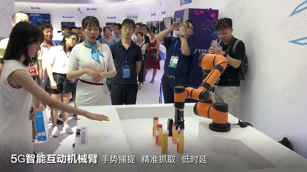 5G智能互动机械臂机器人隔空取物天翼生态博览会AI人工智能手势捕捉高科技互动展览展会亮点活动跳跃互动tioyo