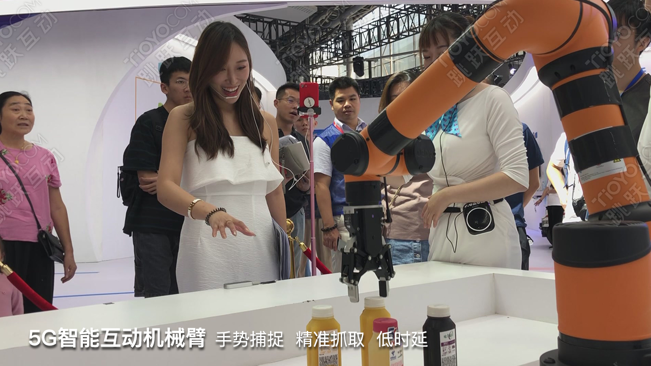 5G智能互动机械臂机器人隔空取物天翼生态博览会AI人工智能手势捕捉高科跳跃互动tioyo