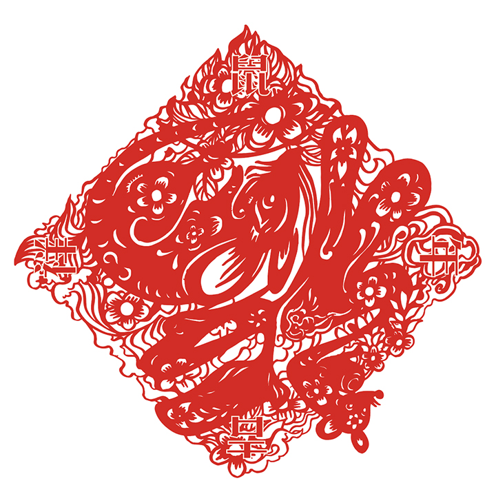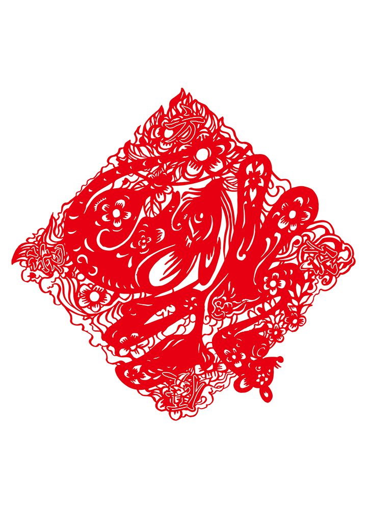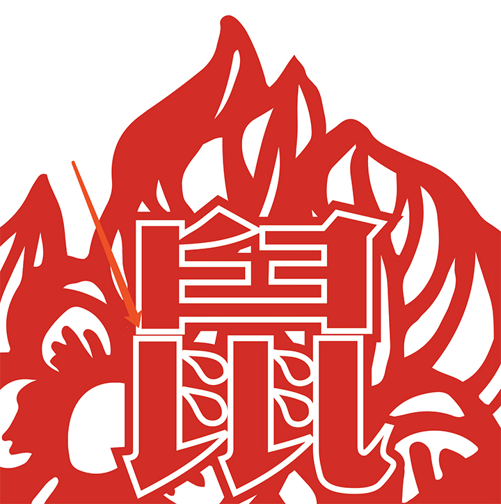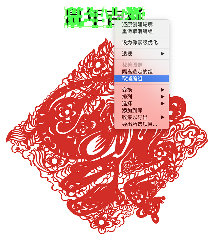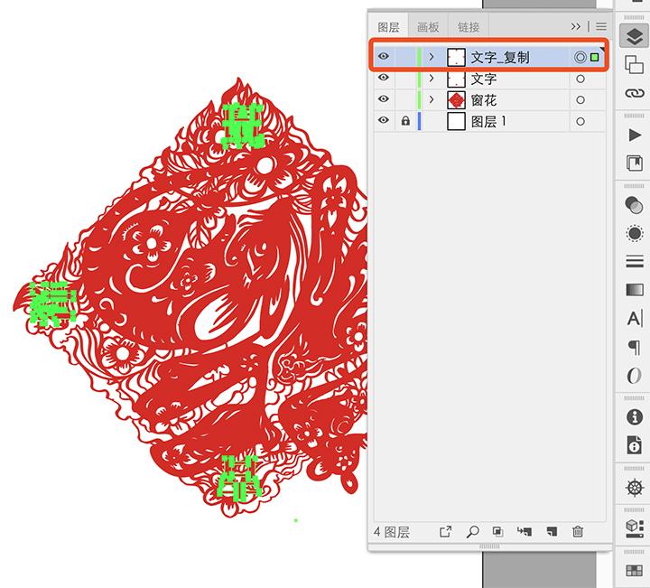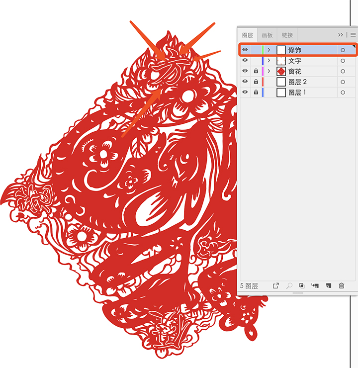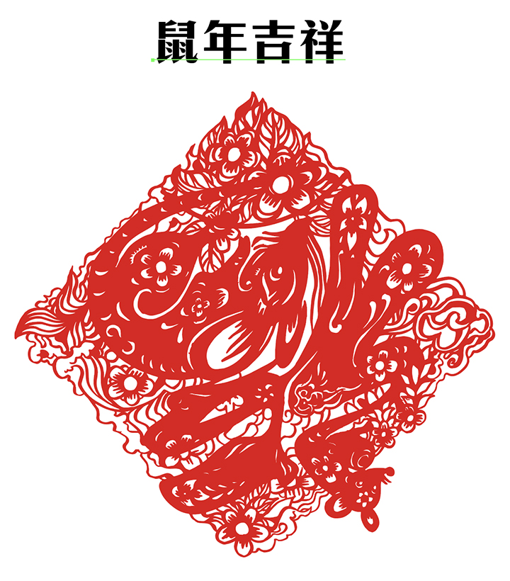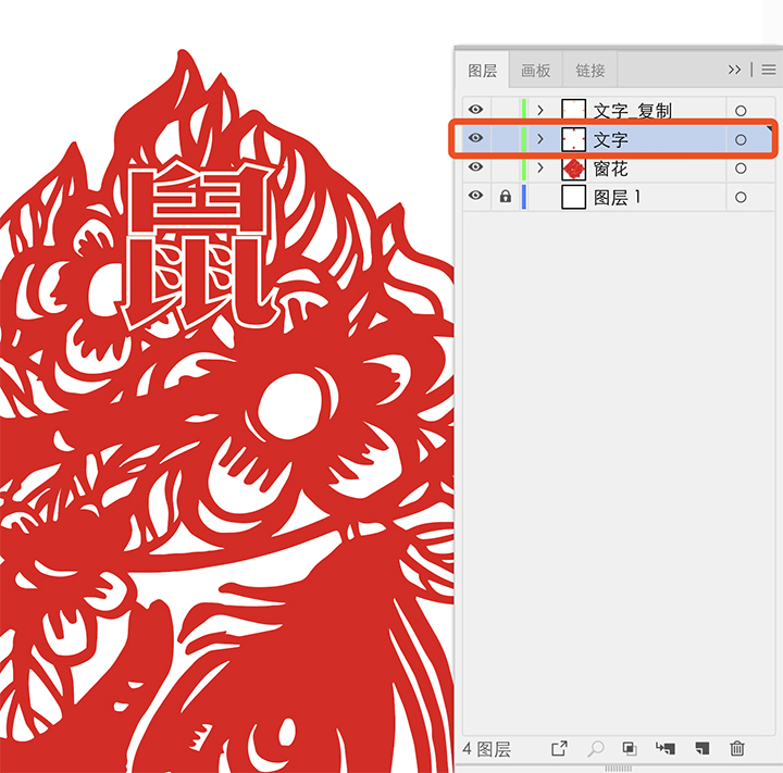 所以最后需要细化,字体的白色描边区域,和相邻的窗花连接处,要有意识的去思考,检查,避免出现裁剪时,一刀下去,字体也跟着被剪掉。可以用钢笔工具适当的绘制连接图形,也调整整体美观性(记得新建图层再绘制,良好的习惯)。