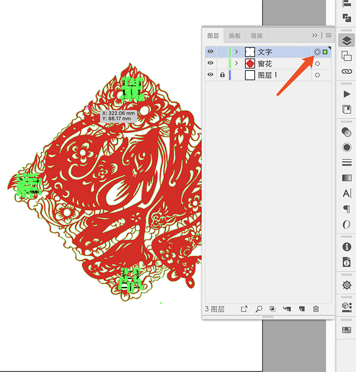 10、从视觉上来看,好像到这一步可算作马马虎虎结束了,但如果是做实物窗花呢?直接这样给人家源文件肯定不行,裁剪的时候,白色区域的图案会掉落,整块文字都会跟着掉落。