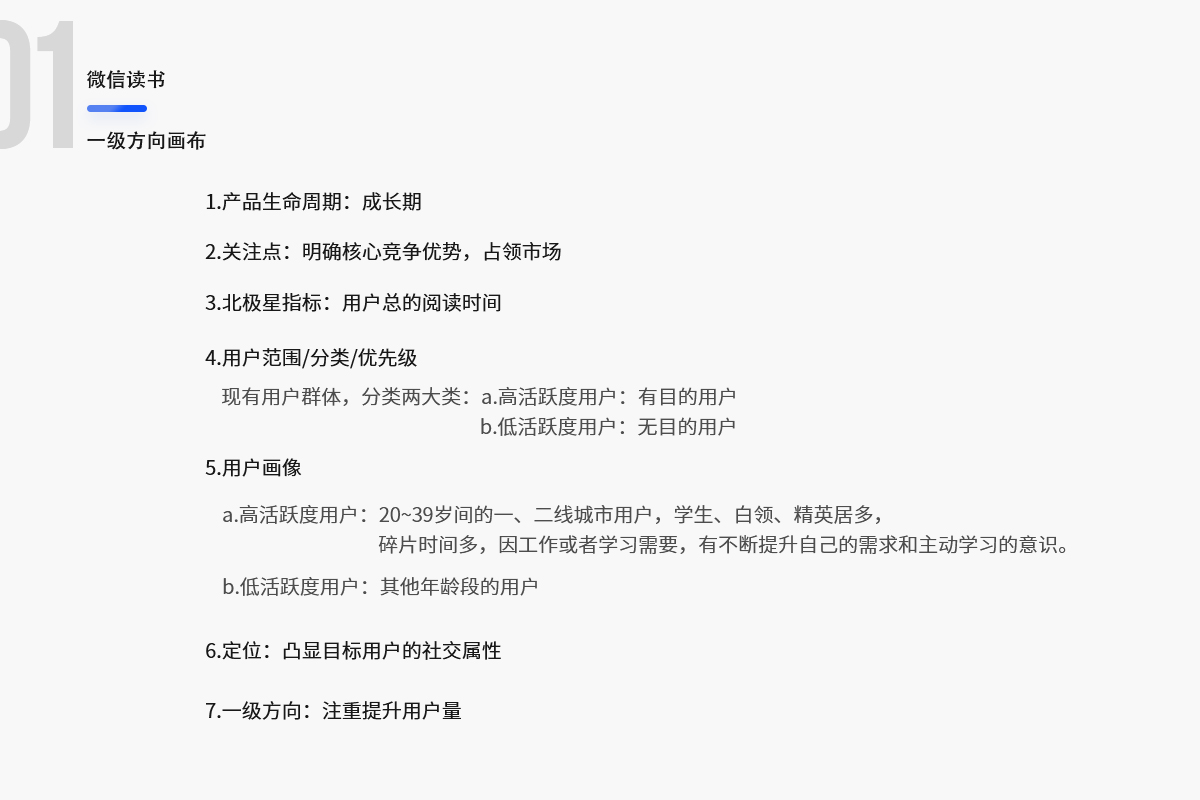 做一级方向画布,先从北极星指标、用户群体、战略方向等方便入手,下面就微信读书,一 一分析。