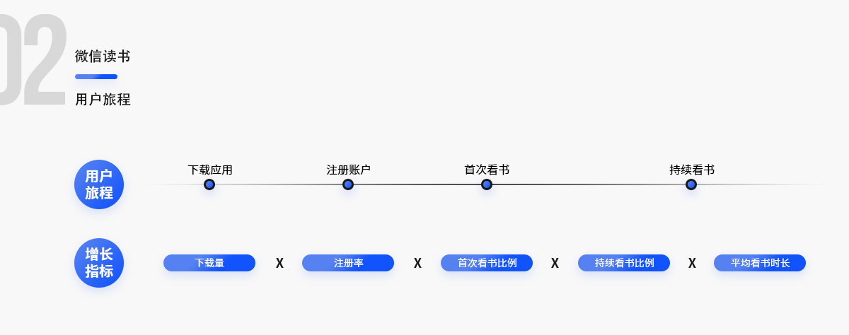 用户旅程及对应的增长指标是:下载应用(下载量)→注册账户(注册率)→首次看书(首次看书比例)→持续看书(持续看书比例、平均看书时长)