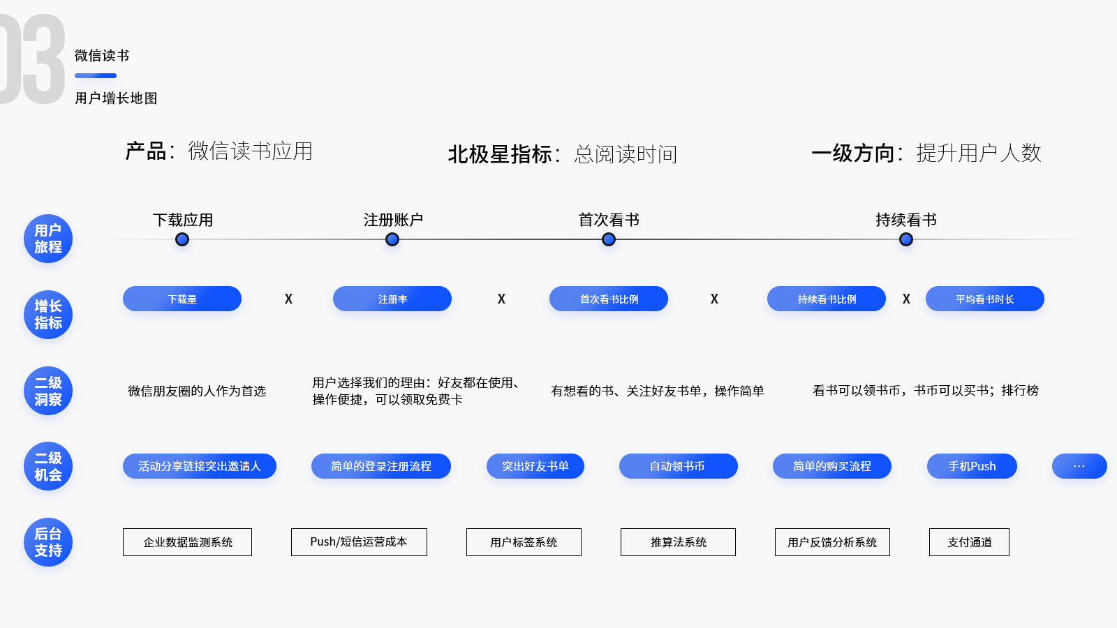 谈到二级机会,和一级方向一样,也是通过洞察,差异化满足,提出能够提升指标的假设,分享两个标志交流下微信读书在这方便的对策。