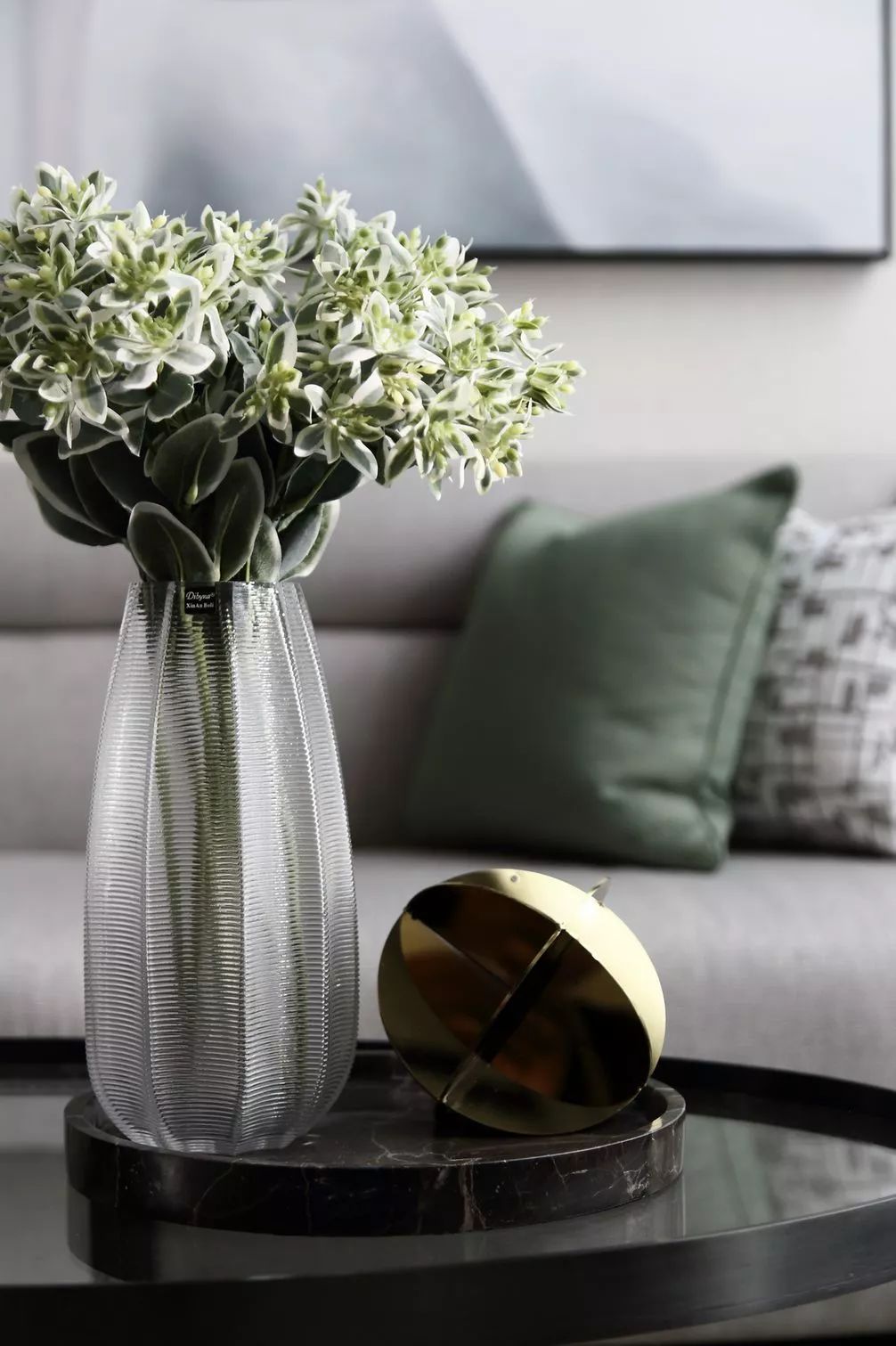 墙面、沙发、窗帘及床饰使用了统一的米灰色调,而绿色调的巧妙使用,如斑驳的深绿地毯、置于桌台茶几的植物盆摘和餐具,以及悬挂于卧室的装饰画等,又让整体氛围多了清新自然的气息,让人感到心情明快。