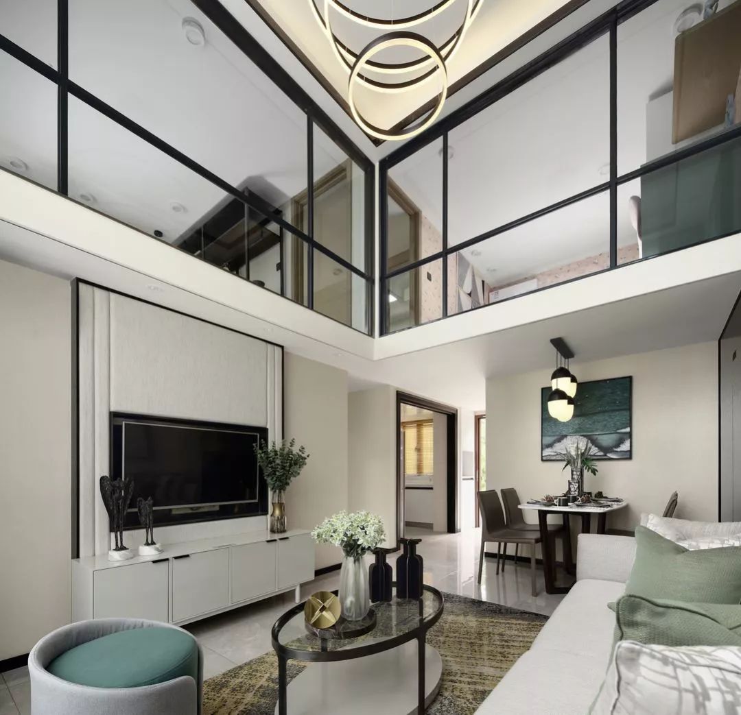 时代豪庭B户型双层公寓样板间采用半围合式布局,充当对外空间的客厅作为设计的中心贯穿整体空间。具有金属质感的吊灯自二层顶端悬垂而下,金属框架和玻璃组成的空间隔断,以及客厅与餐厅之间的开放式连接,打破了传统LOFT格局的狭窄和蔽拢,让有限空间得到尽可能的放大和延伸。