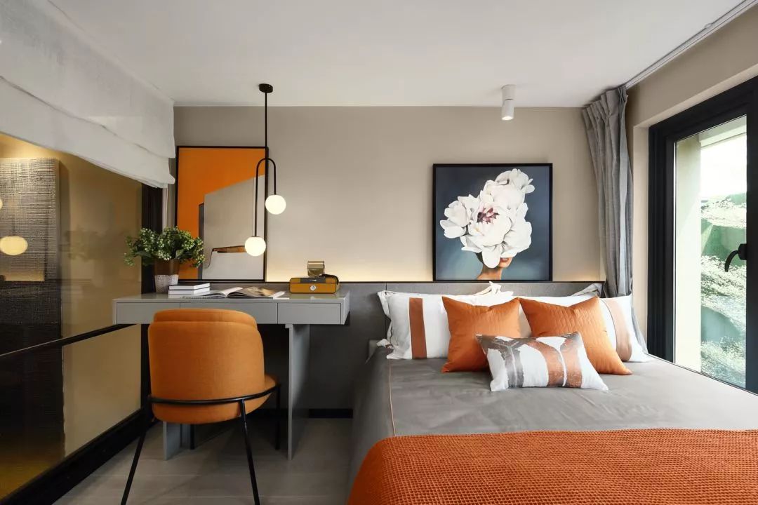 卧室的设计沉稳、大气,更加注重线条的质感,在颜色的配置上,与总基调相吻合,尽显优雅和浪漫,而次卧则采用了明丽的橙色,以满足老人或孩子对温暖和亮色空间环境的需求。