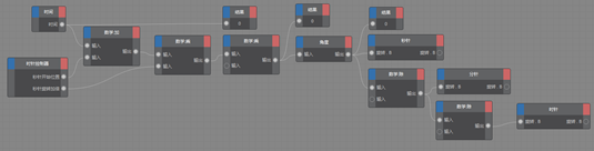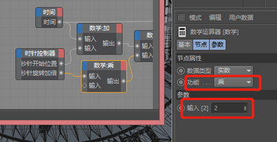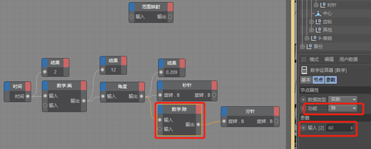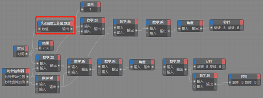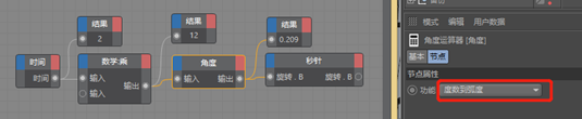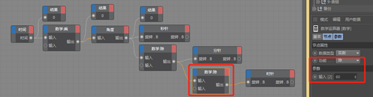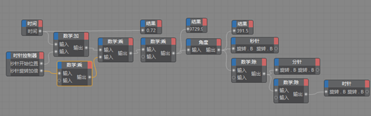 d. 将输出结果直接连接到秒针节点,播放发现旋转超快,那是因为需要将角度转化为弧度,因此增加角度节点,设置为角度转弧度:
