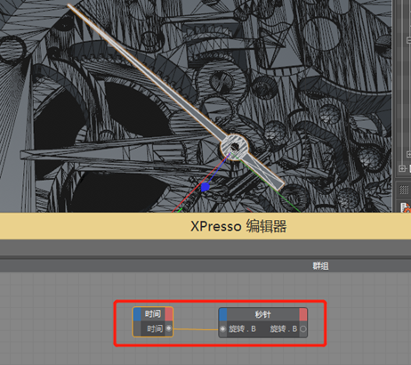 5. 先制做连续旋转的秒针,新建时间节点,将秒针对象拖入XPRESSO,并将R.B旋转拖入秒针节点,同时作为输入、输出: