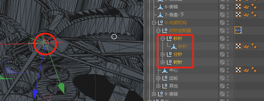 3. 将时针控制器组的坐标中心对齐到旋转轴中心,新建三个空对象作为子集,并将秒针、分针、时针分别放置在三个空子集下,这样三个指针的旋转中心均与旋转轴的中心保持一致: