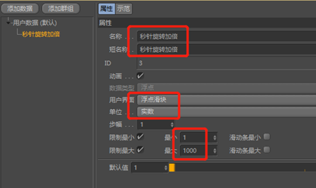 a. 在时间控制器下新建秒针旋转加倍数据,参数设置如下: