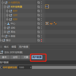 10. 播放测试,发现时针旋转太慢,无法观察旋转效果,因此添加一个用户数据,与时间相乘,可以根据需要调整旋转速度: