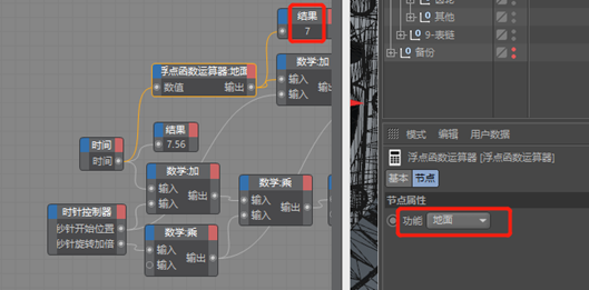 14. 下面为秒针增加间歇运动效果,那就是秒针间隔一秒旋转6度,可使用浮点函数运算器-地面,为时间取整,复制原有的秒针链路,即可实现: