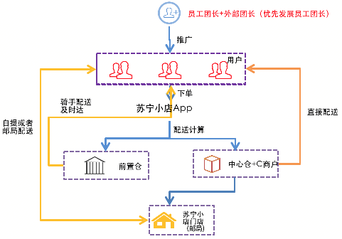 苏宁小店社区团长专注于给社区居民提供高性价比的产品及服务。主要以线下社区为单位, 通过苏宁小店及发展的社会团长作为交易的枢纽以及终端用户的收取和信息发散中间点。 通过苏宁邮局,苏宁金融,形成差异化竞争优势和行业壁垒;