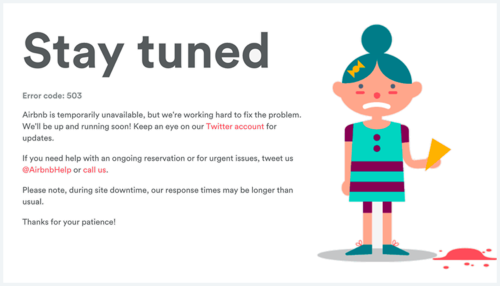 404页面是永久状态,而维护页面是临时状态。因此,我们提供的信息会不同。告知用户:何时备份? 是正常还是意外? 如何在线恢复? 有时候,包含这些信息的原因太多了。让人们了解情况的最佳方式是将他们与你的有效社交媒体帐户相关联。