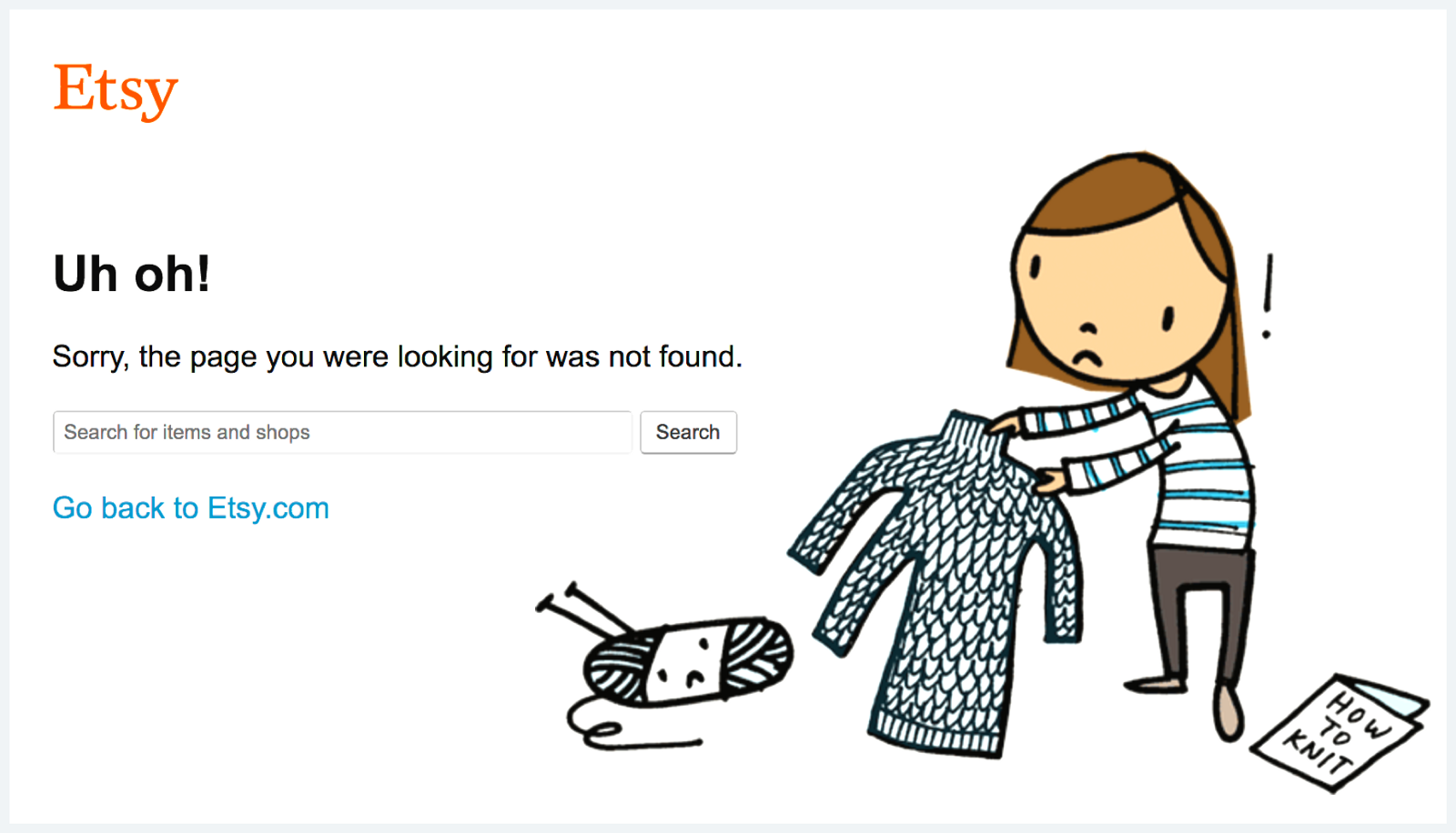 这是与您的用户互动的绝佳机会。利用公司的象征来强化品牌。Facebook使用一个破碎的拇指作为类似的符号,而Etsy是做工艺品的平台,所以她使用搞砸了编织毛衣的插画来表现错误。