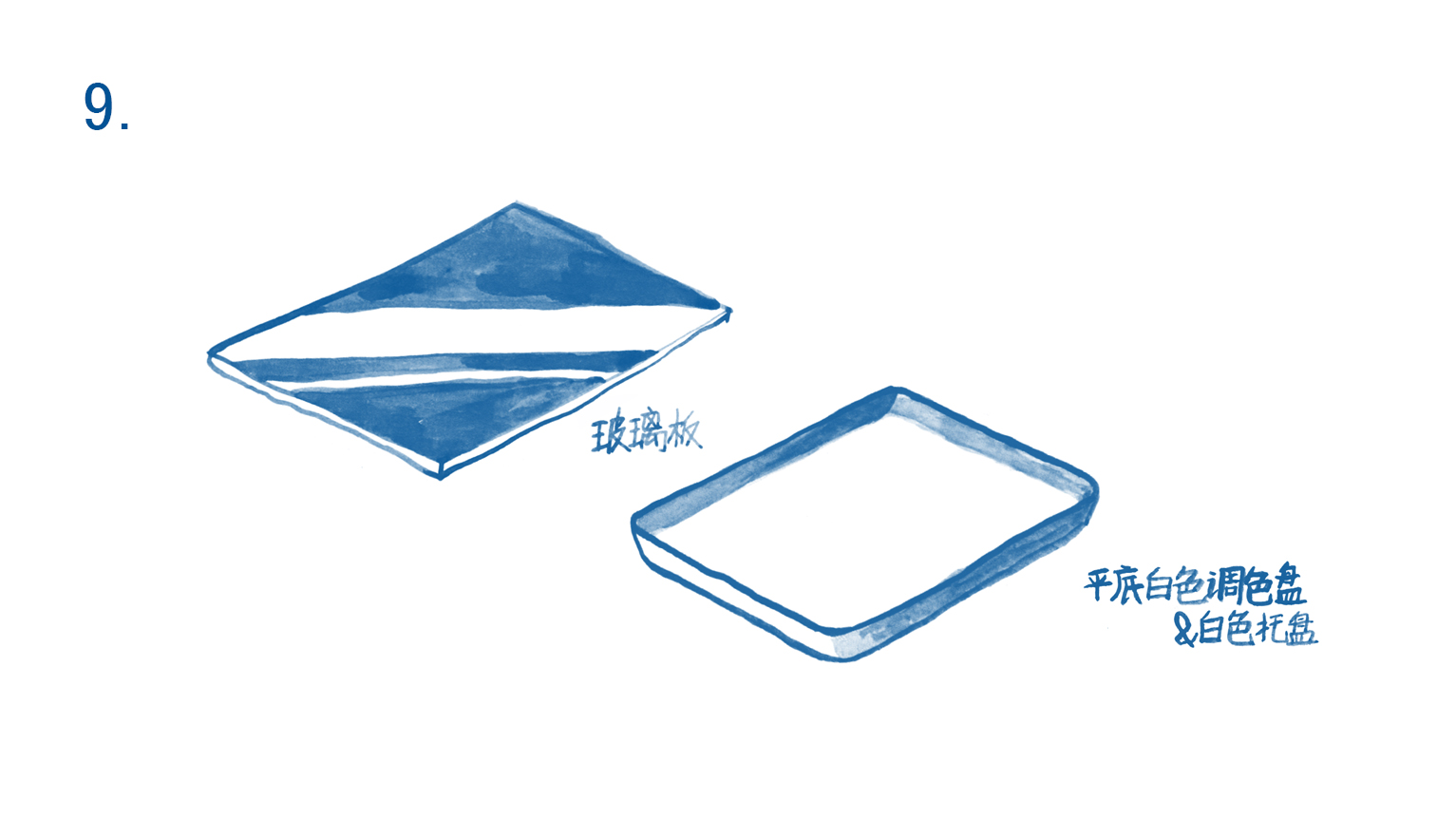 调合油墨时使用。使用玻璃板时,为了准确识别油墨颜色,需要在玻璃板下衬白纸。也可用平底白色调色盘调和油墨。