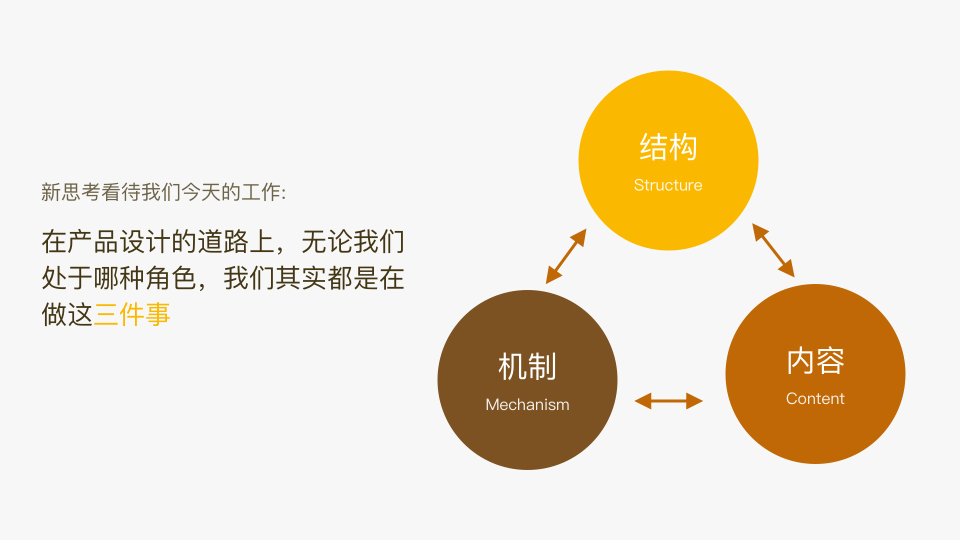在这里,我们要有个新的思考去看,而不是从交互或视觉去看我们今天做的工作。在产品设计的道路上,通常我们会把产品设计粗略地分成这样几层:我们如何定义功能,我们应该有怎样的交互设计,有怎样的视觉表现,然后再到品牌运营如何去做我们整个产品外部的推广。在这个过程中,大家下意识被分成了更多的角色:交互设计师、视觉设计师、品牌的运营市场。我想提出一个新的思考是我们今天所说的所有产品,不管在哪种业务下,是做手机还是一套工具,亦或是做一个微信公众号。我们其实在做三件事。