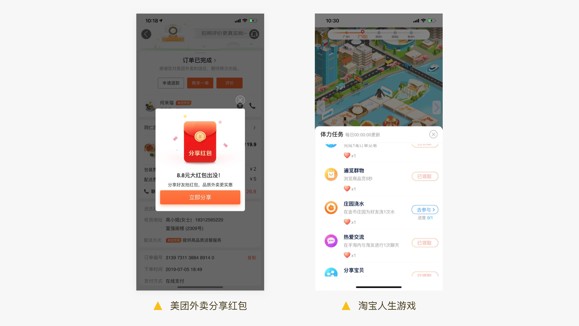 它是最隐形的一个东西,我们感觉不到它,但是它以这样的方式呈现。美团外卖拿到一个红包,我要转发,因为我的消费能被新获得的红包抵扣;淘宝人生的机制就是游戏,我在换装做任务的时候能直接跳转到对应的商品。所以,这种东西很隐形,它只是以视觉化游戏化的方式呈现出来,但实际上本质上最核心的是一套基于什么来持续性推动的机制。