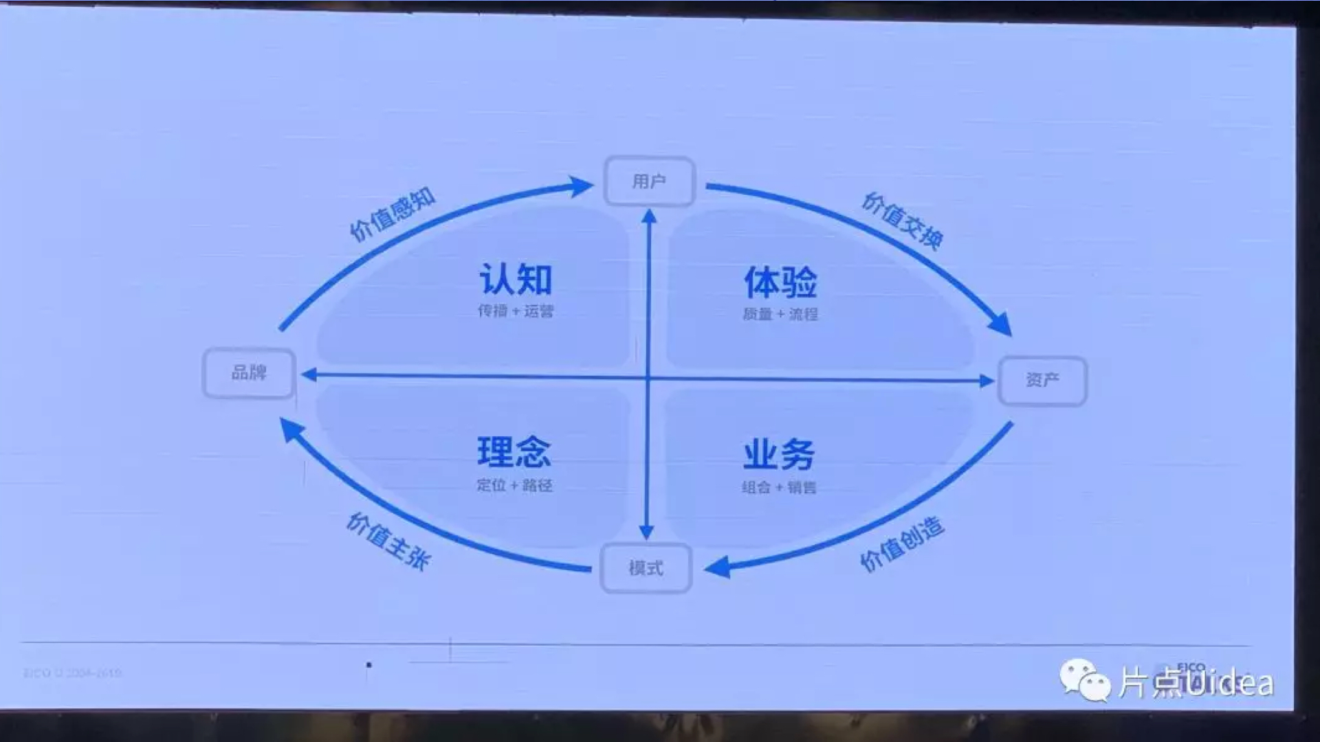 在这个过程中资产到模式其实才是真正产生价值的部分,我们如何通过资产与模式来产生价值,这个其实就是很多创业者一开始的阶段。而第二个就是价值主张,也是定位,你要通过模式到品牌的过程产生一个价值的主导,就是你要知道你在说什么,你要让消费者理解你们是一个什么样的定位。第三个是消费者对于价值的感知,品牌怎么碎片化的传达给用户的阶段,让他感知到你是这样的,而你不是你自己的YY。然后最后一个就是价值交换。
