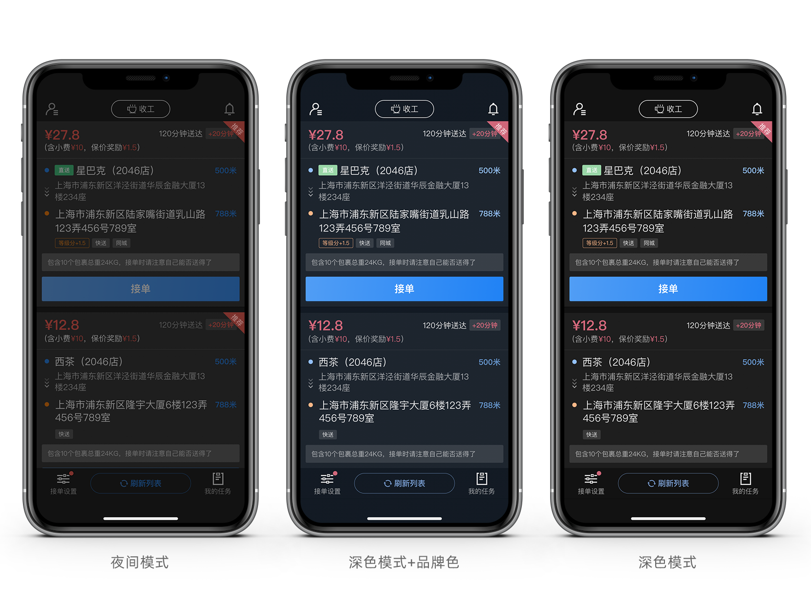 根据 Material Design 深色主题设计规范,应用到达达骑士端App主要页面进行探索。