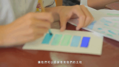 老师让每个同学选出一两个当地代表性景点,并用形容词来描绘这里的感觉,从而调制出 5 个颜色来制作色卡,来表达这里。