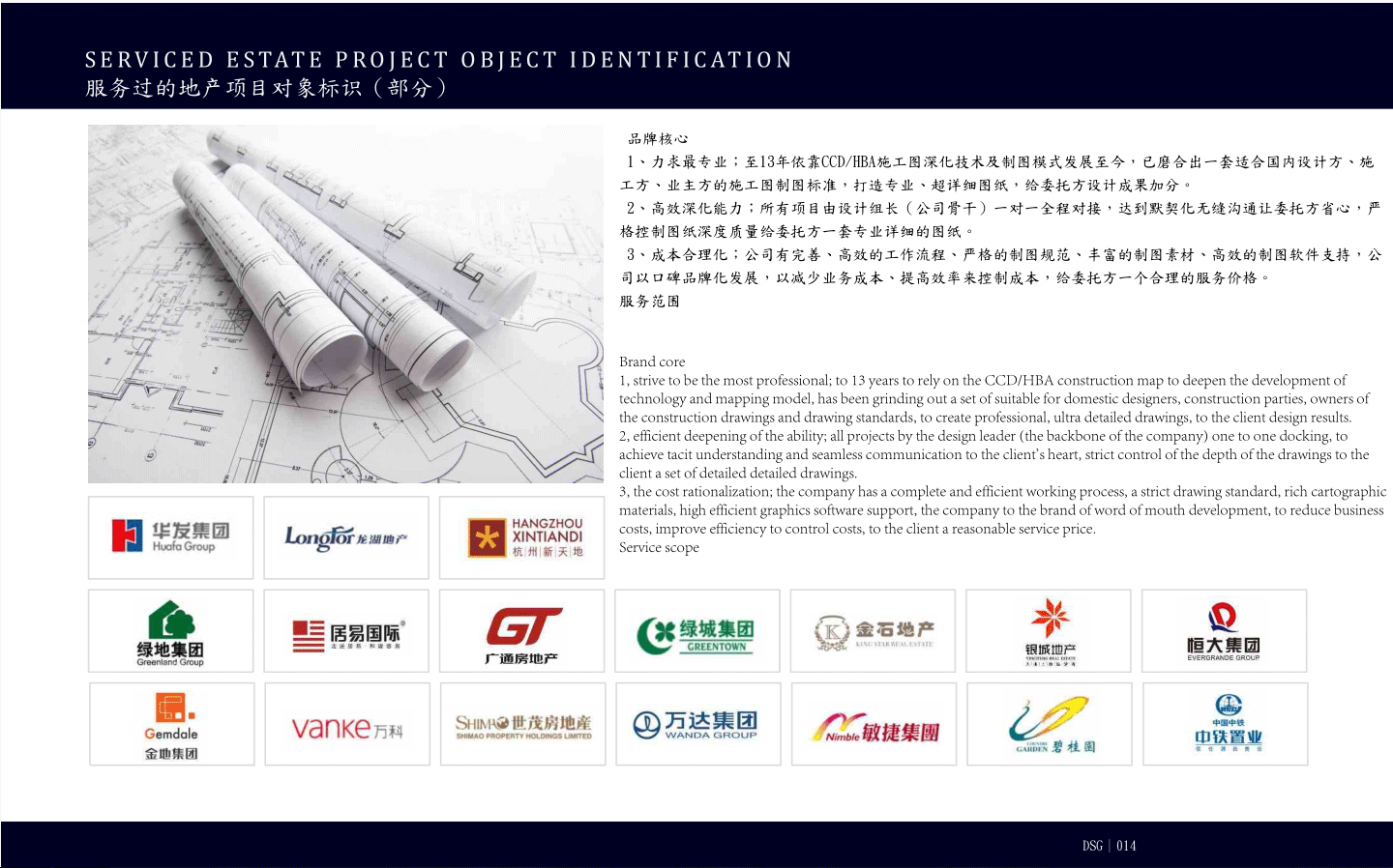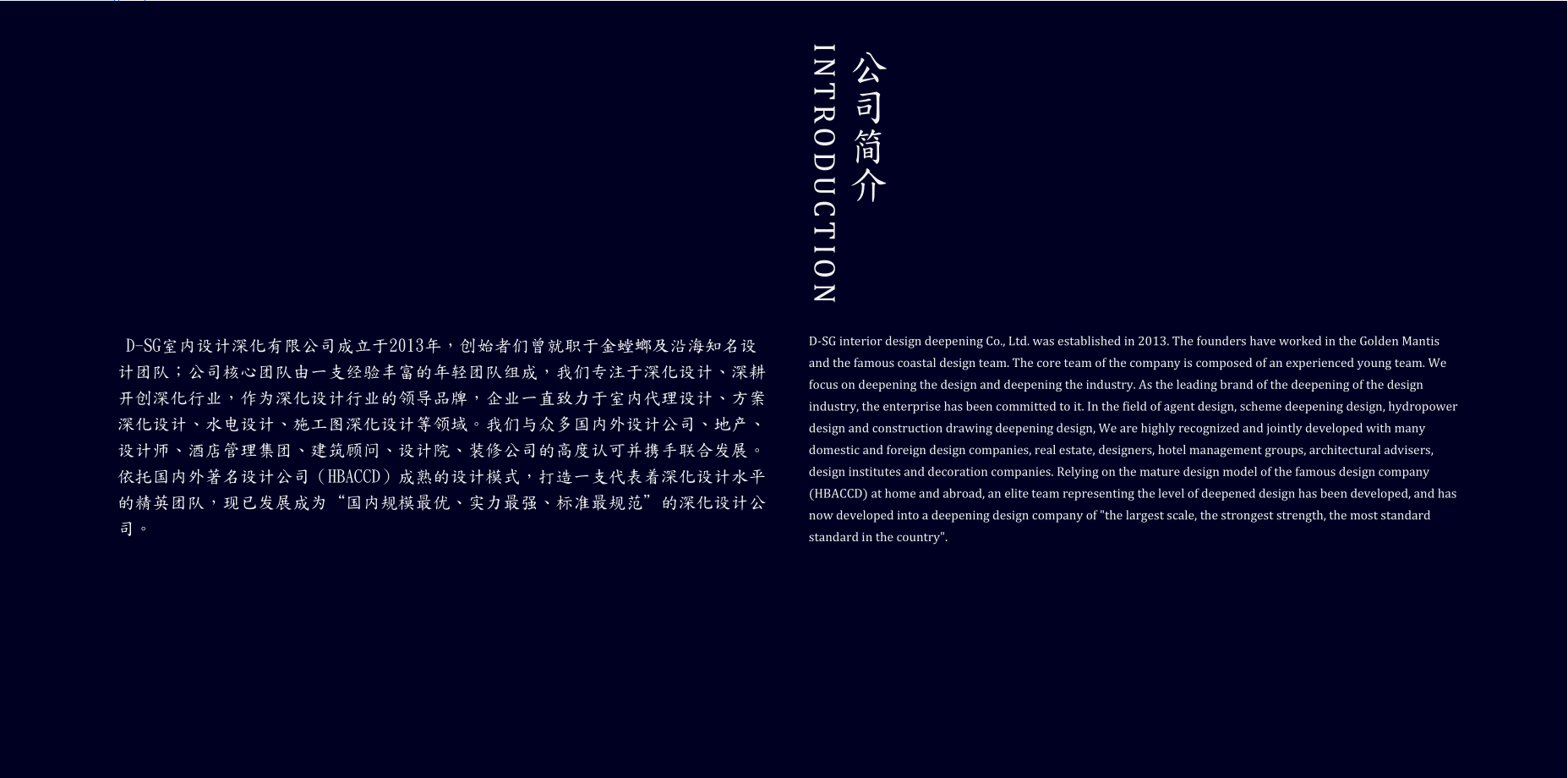 D-SG室内设计深化有限公司成立于2013年,创始者们曾就职于金螳螂及沿海知名设计团队;公司核心团队由一支经验丰富的年轻团队组成,我们专注于深化设计、深耕开创深化行业,作为深化设计行业的领导品牌,企业一直致力于室内代理设计、方案深化设计、水电设计、施工图深化设计等领域。我们与众多国内外设计公司、地产、设计师、酒店管理集团、建筑顾问、设计院、装修公司的高度认可并携手联合发展,依托国内外著名设计公司(HBACCD)成熟的设计模式,打造一支代表着深化设计水平的精英团队,现已发展成为“国内规模最优、实力最强、标准最规范"的深化设计公司。