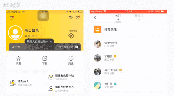 如‘好好住’和某阅读APP(名字忘了~),就利用陀螺仪的‘重力感恩’优化视觉引导:手机往左/右翻动时,视觉元素跟着往左/右旋转、滚动。