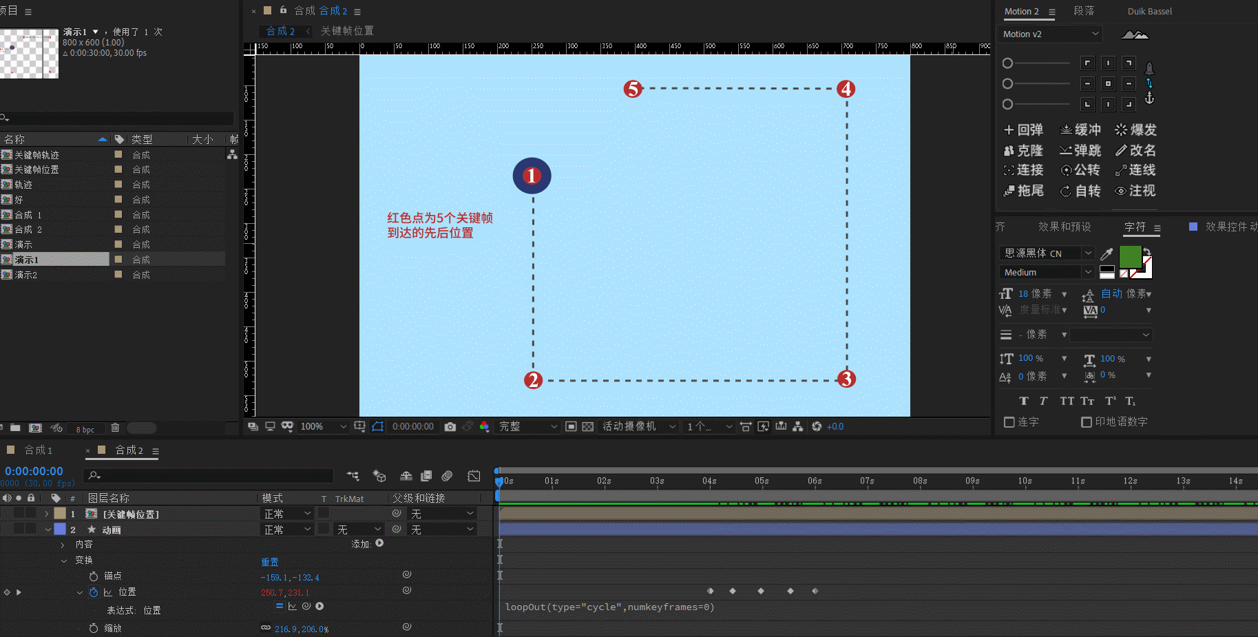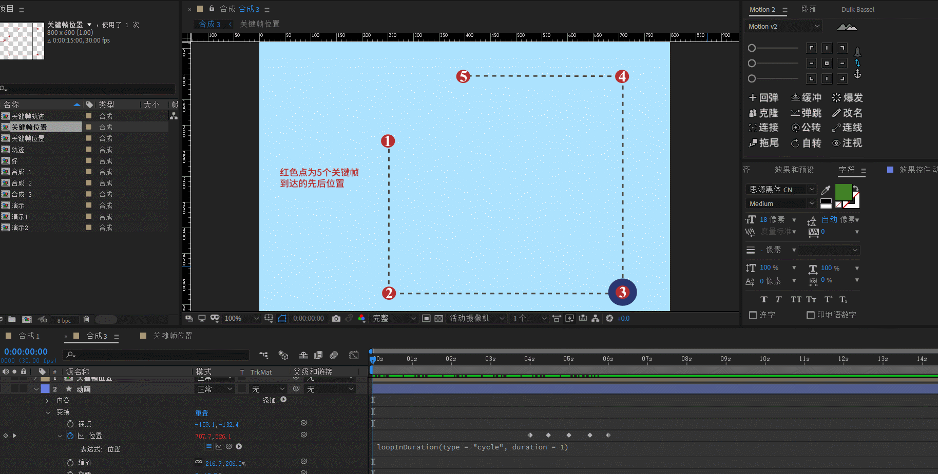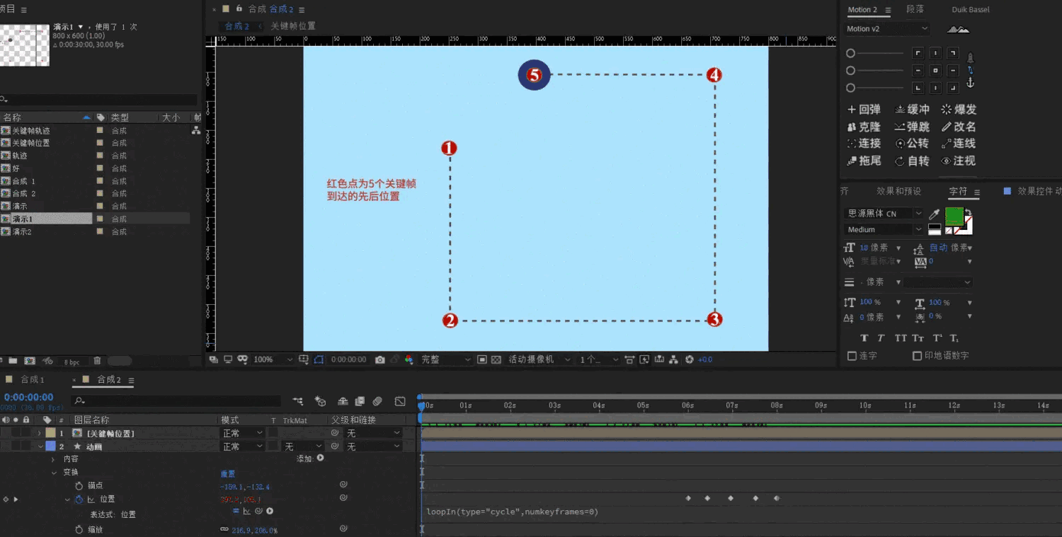 动画效果如下GIF图,前4秒不动,4秒开始关键帧动作,并在完成后一直循环第3-5关键帧的动作