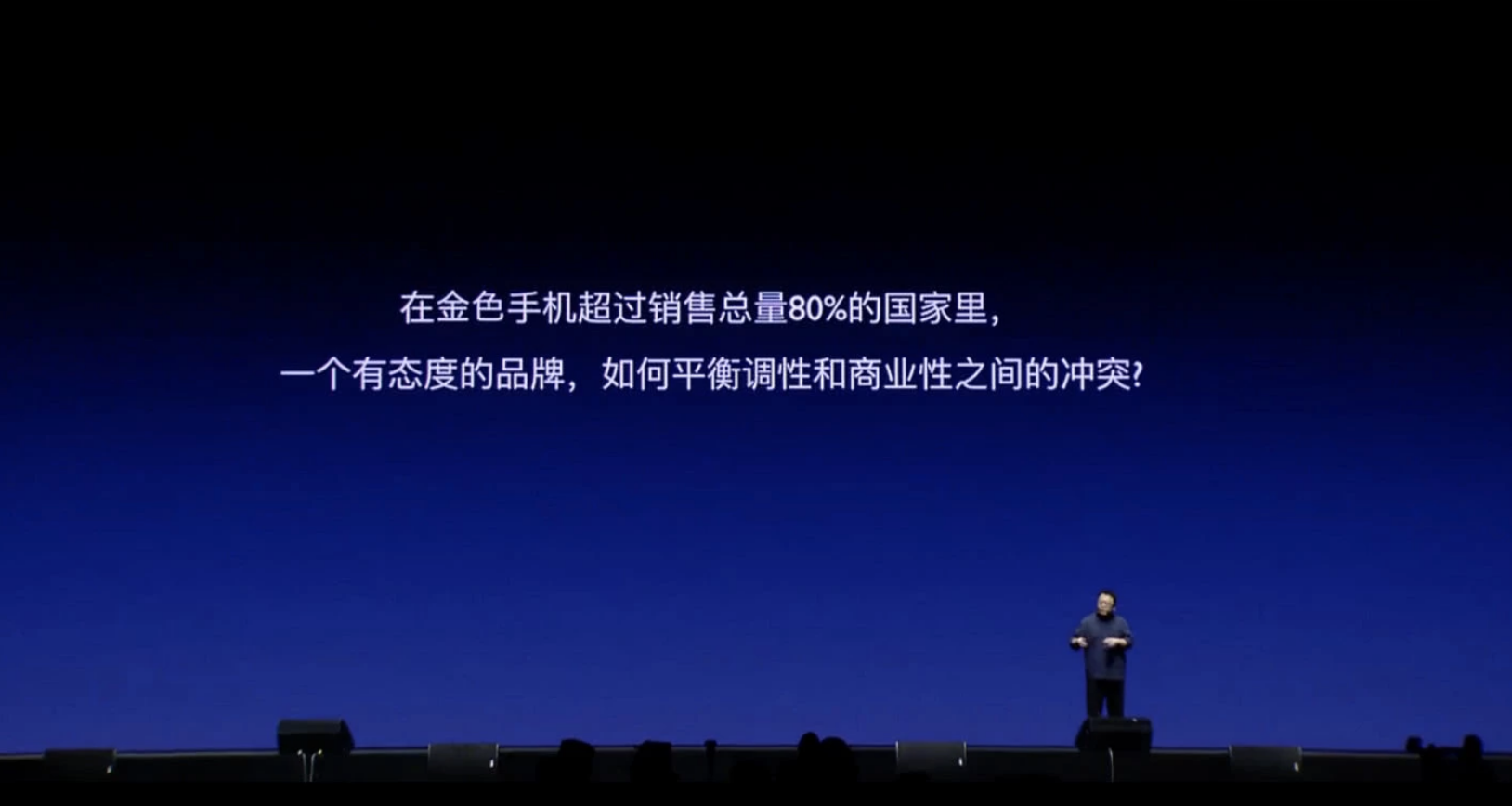 由于演讲者的站立位置多少会对文字有所遮挡,且对于前排观众的影响更大些。考虑到观看体验,尽量把所有页面的居中文字都上移一些。以<时间的朋友>发布会为例,在前排这个机位,罗老师几乎能遮挡1/2的屏幕。