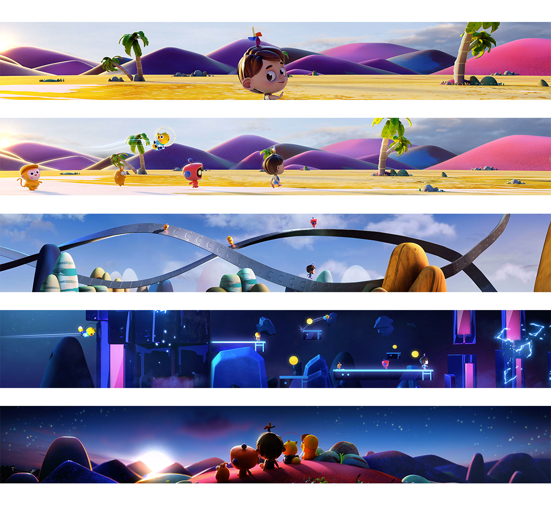 本次发布会的主题是成长的色彩。开场视频描述的是一位小朋友在成长的路上遇到四个小伙伴,即准备发布的四款少儿产品的IP。它们分别是代表数学能力的小狸、代表阅读能力的乐兔,代表英语能力的小猴子以及代表编程能力的机器人。在和它们的交流中成为朋友从而点亮自己四种技能的故事。头上的风车代表技能,也是本次发布会的视觉主元素。