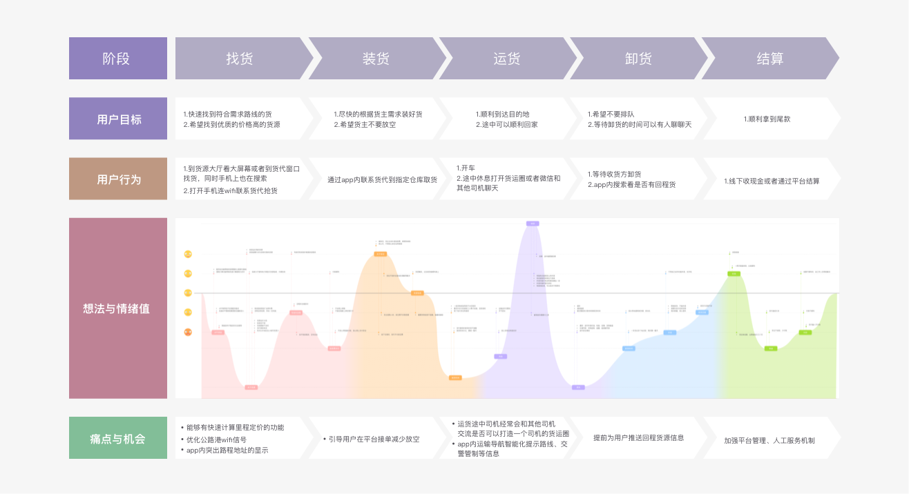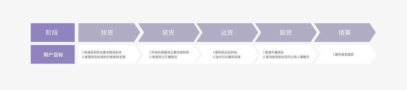首先我们先将用户的一个核心完整的流程进行阶段划分:找货-装货-运货-卸货-结算。在每一个阶段下找到用户目标