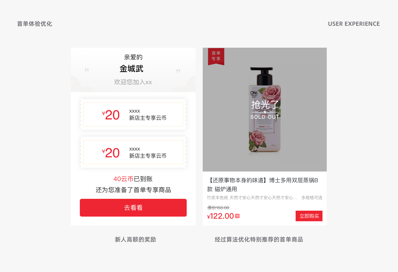 验证了我们的猜测和想法之后我们也对整个首单体验进行了优化,首先新注册登陆的用户我们给予了一个比较大的折扣优惠券,然后引导他去首单专区进行购买,专区的商品进行了算法的推荐,让用户在首单购物中有一个非常好的体验。当用户在首单体验中倡导甜头之后,针对后续的复购,以及推荐意向有了非常大的提升。