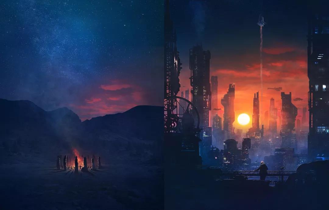 还有些作品会加上人和机械等,再进行调色、添加滤镜。