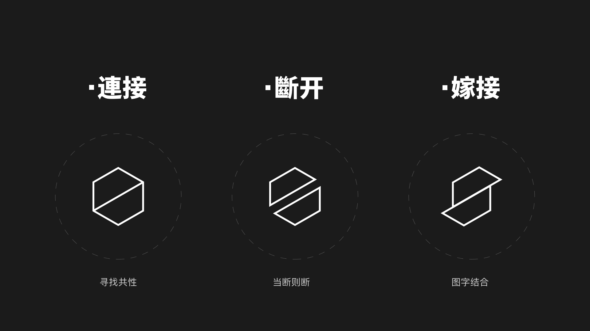 把某处笔画进行切割断开,使笔画做出一定“牺牲”,从整体考虑;断笔是为了使整体的设计风格更统一,常与连笔法配合使用。