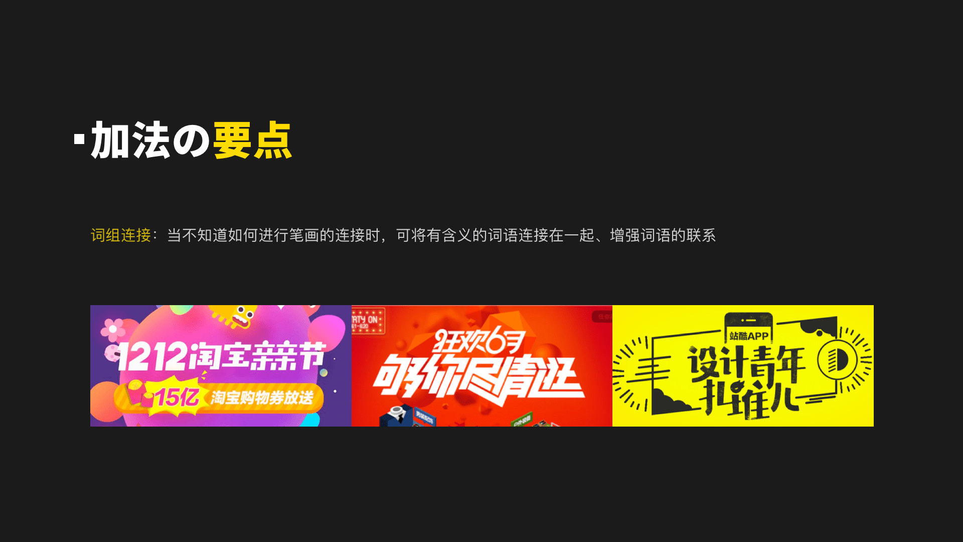 加法:笔画的连接要寻找他们的共性进行连接,连接要自然。