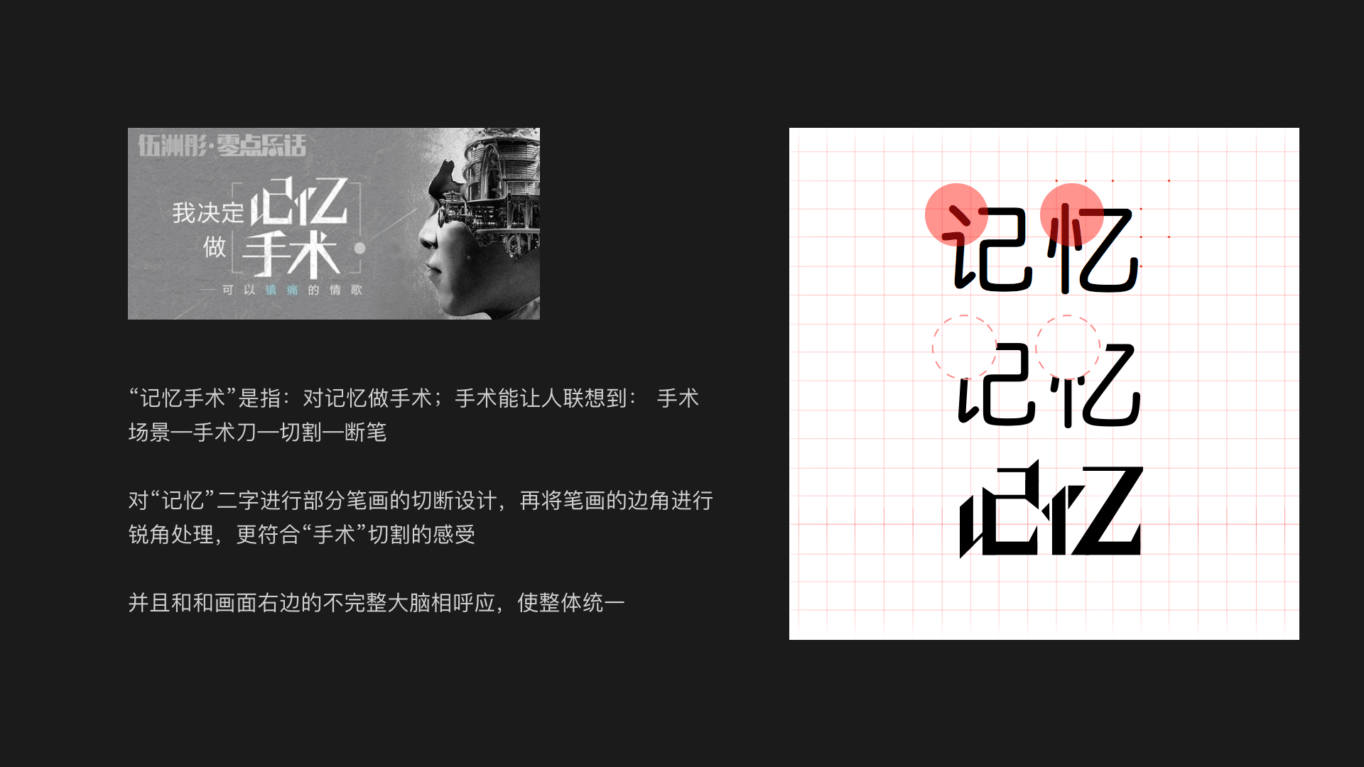 对“记忆”二字进行部分笔画的切断设计,再将笔画的边角进行锐角处理,更符合“手术”切割的感受,并且和和画面右边的不完整大脑相呼应,使整体统一。