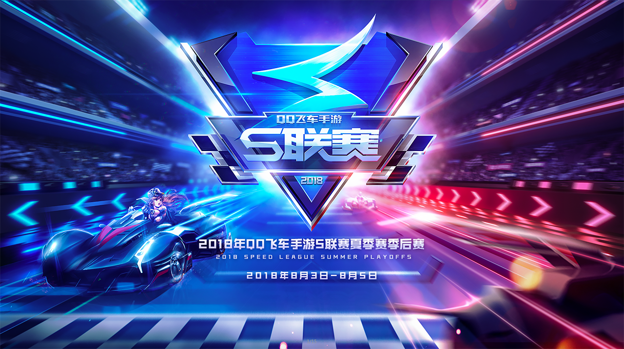 2018《QQ飞车》S联赛主kv设计特点:画面突出速度感与俯冲感,一点透视构图,logo均在视觉中心,视觉重在于赛事主题与赛车关系。