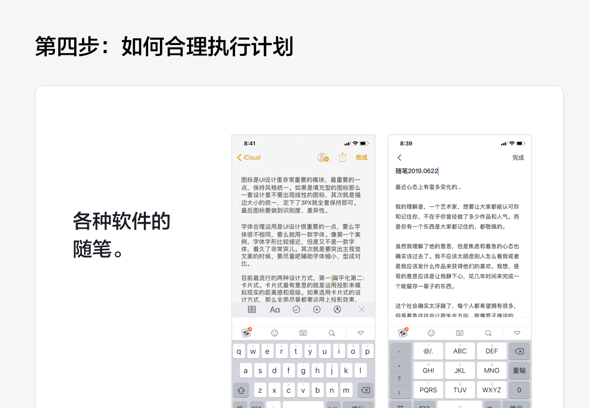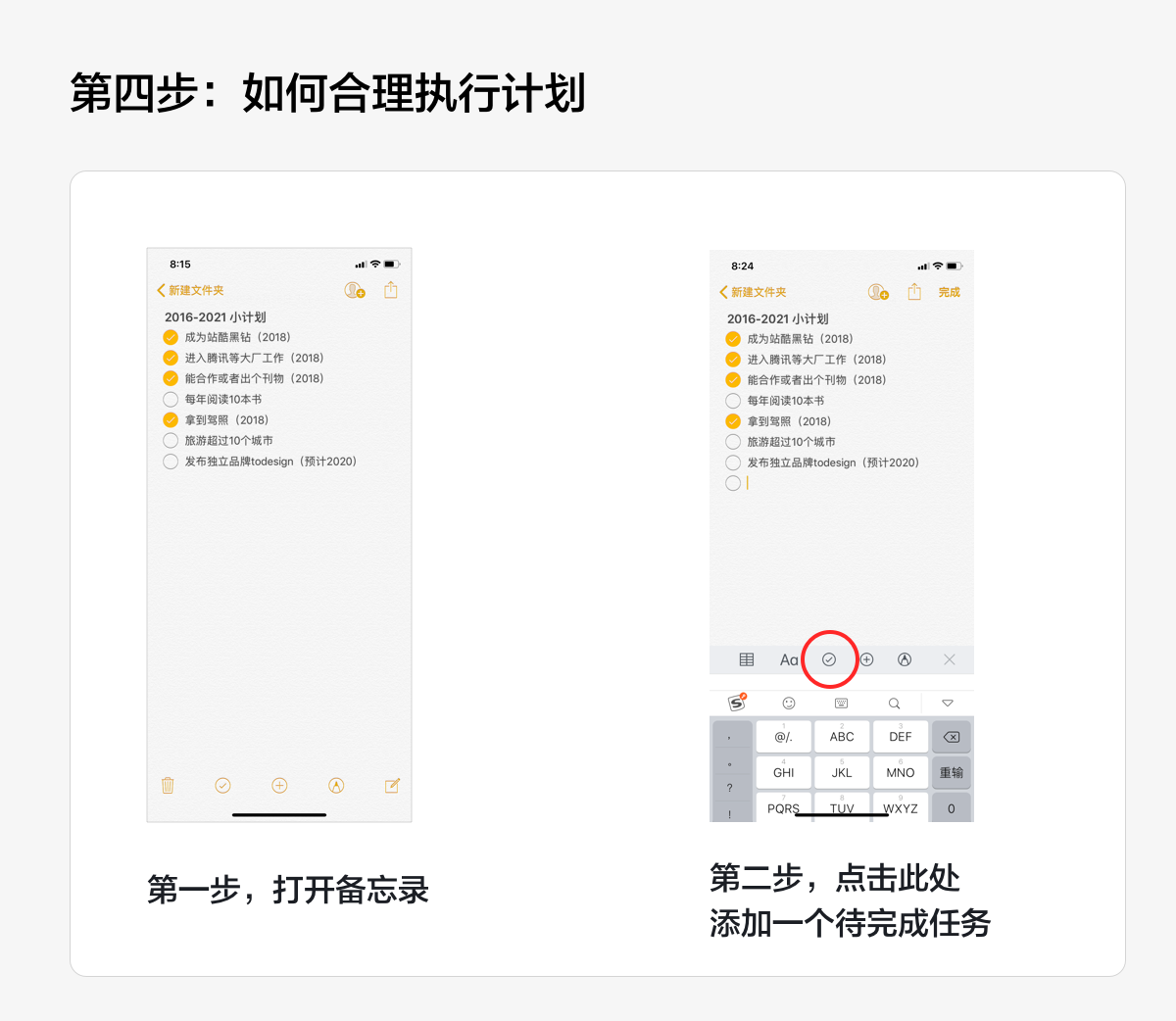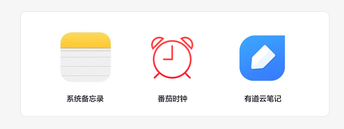 在第三步中,我们得到了一个较为清晰可执行的计划,现在给大家聊聊具体到每周,每天的时候,用什么方法和工具辅助我们达成计划。我先列清单,用到的软件有1、ios系统备忘录(本子和笔也行),2、番茄任务,3、有道云笔记。