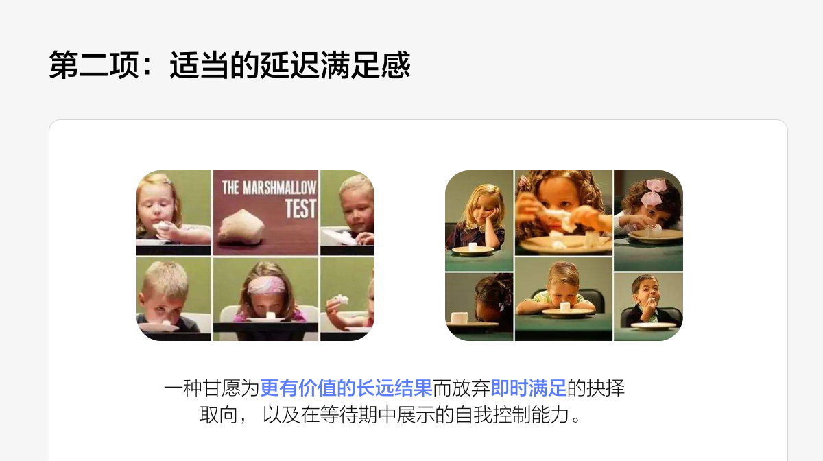 很多人都听过斯坦福棉花糖实验,我这里就不阐述了,感兴趣的同学可以百度了解一下。这个实验阐述的观点就是一种甘愿为更有价值的长远结果而放弃即时满足的抉择取向, 以及在等待期中展示的自我控制能力。