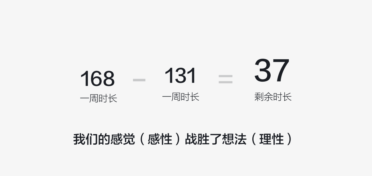 每个人一周都有168小时,不论是千万富翁或者是娱乐明星,大家时间都是一样的。除去了五天工作时长45小时,再除去七天睡觉时间56小时,还剩下67小时。如果说吃饭、洗漱、娱乐各种时间算一起30小时的话,实际上我们每周可利用的时间依旧是超过30小时以上的。我们没有理由说完不成自己周的计划,只是有时候我们的感觉(感性)战胜了想法(理性)。