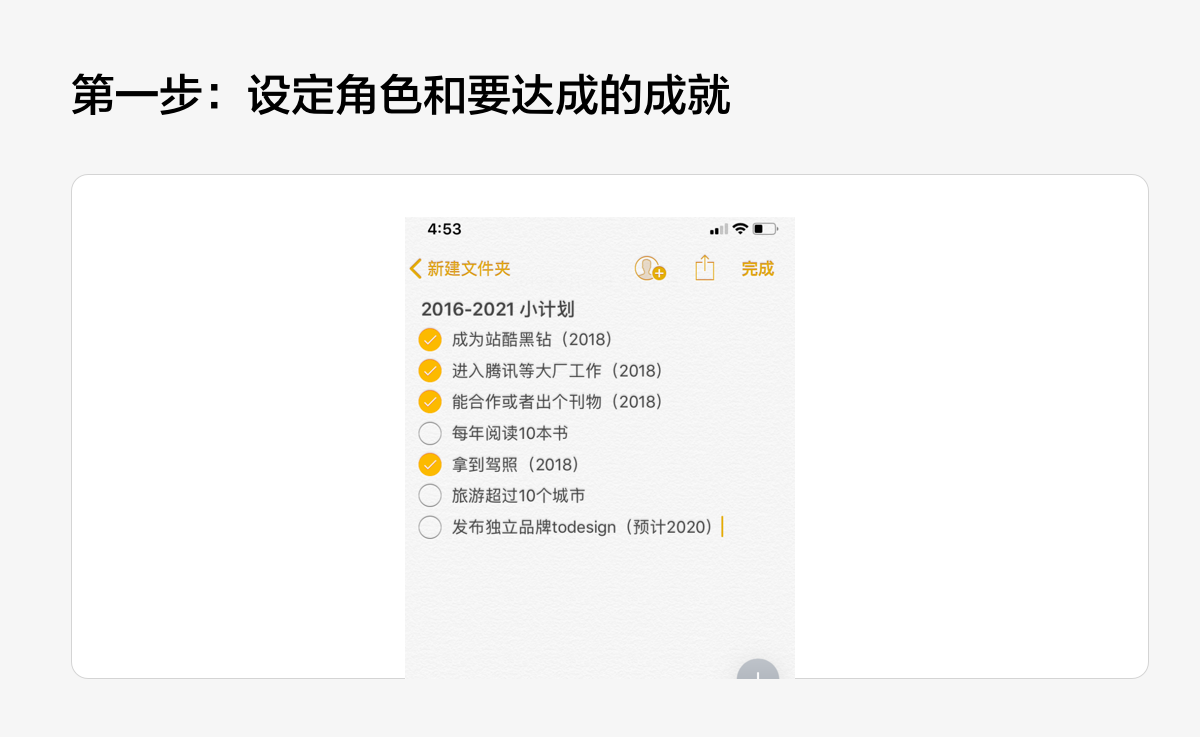 这是我16年设定的计划,有部分都实现了,还有一些也在努力达成。在这一步,我给大家的建议就是,不要去欺骗自己,一定要切合实际的去构想。把你想成为的角色和想完成的事情记录出来,切记不要模仿别人的路径,你不是别人。别人可以设定个赚一亿的小目标,但对我们而言是非常不切实际的。