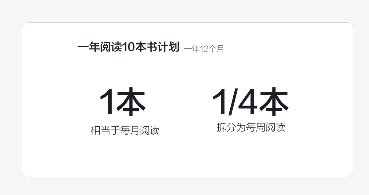 但是如果拆分成每个月,那就相当于每月读一本多一点的书就可以了,这样就能保证一年阅读10本书的目标。然后每个月又有4周,在拆分为每一周平均阅读该书的四分之一即可。如图。