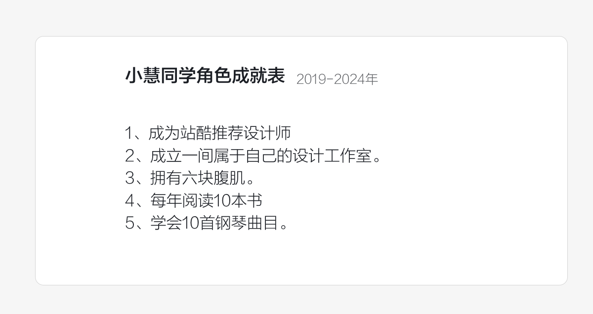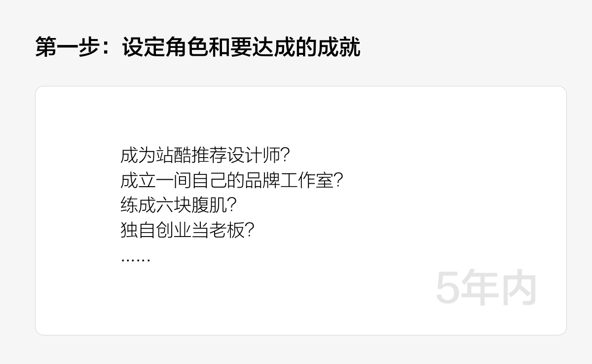 5年这是一个较为合理的周期,比如你想成为站酷推荐设计师,或者是开一间自己的设计工作室,又或者想让自己练成六块腹肌等等。不论是事业上还是生活上,都是可以大胆的去设想的。