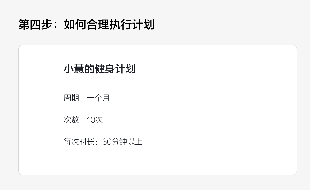 因为健身是一个非常不确定的词,五年内坚持健身到底要如何坚持是一个未知数。所以小慧同学应该把该计划拆分成,每月保持健身10次,每次30分钟。必须要把很大的一个东西,拆分成可执行的才行。那么总结下来,小慧在第一个月需要做的事情如下图。