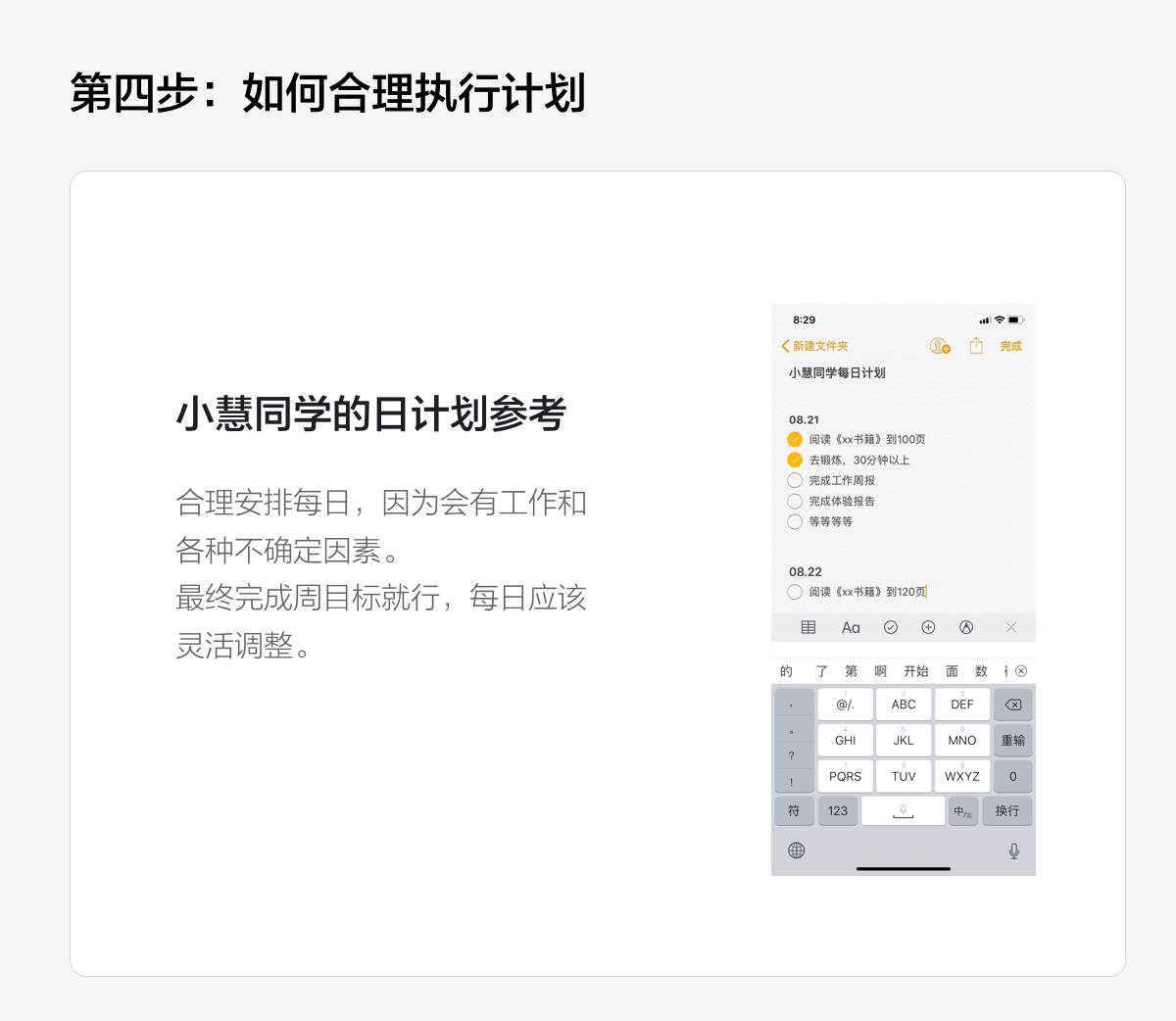 有了周的计划之后,就可以继续拆分成每日的,比如说星期一的时候,小慧的工作安排较忙,可以只进行锻炼的计划,把阅读计划放在周二,都是可以的。每日的todolist一定是灵活的,因为我们还有外界的因素干扰,所以我们只要保证每周能完成所有计划就行。每日只需要灵活去调整,去应对即可。